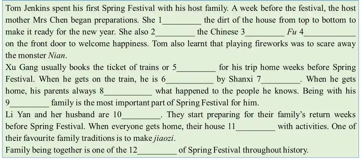 1.本主题是关于中国传统节日—春节。春节是阖家团圆和幸福生活的展现,代表着人们对未来美好生活的希望。在初中的时候学生已经接触过关于中国传统文化节日的文章,例如中秋节、龙舟节、元宵节和春节等。本主题将以三个不同身份的人,来进一步讲述春节对他们的意义。TomJenkins是一名住在南京的交换生,16岁。这是他第一次在中国过春节,主要讲述了在春节到来之前他的所见所闻。徐刚是一名在上海工作的电脑工程师,28岁。文章讲述了他从上海坐火车回家过春节的场景,他认为回家是春节里最重要时刻。李艳则是一位来自黑龙江,年龄76岁的老奶奶,讲述了她和丈夫为迎接孩子们回家过春节所做的准备,对她来说,春节就是一家人在一起开开心心。通过文章的学习,学生们知道春节对我们的意义重大,加强文化自信。