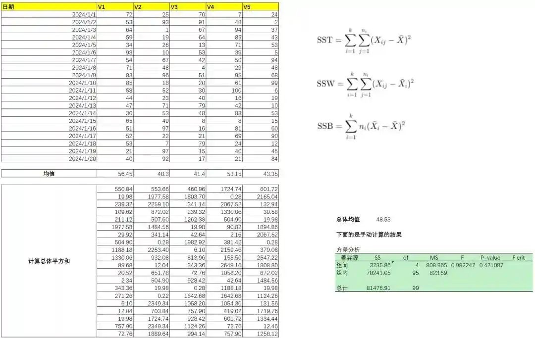 接下来我们用Excel和Python实现并验证SST=SSW+SSB