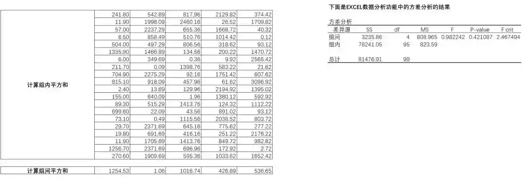 从上面的excel手动计算,我们很清楚的了解到总体平方和=组内平方和+组间平方和,并且和EXCEL数据分析工具对比结果一致。