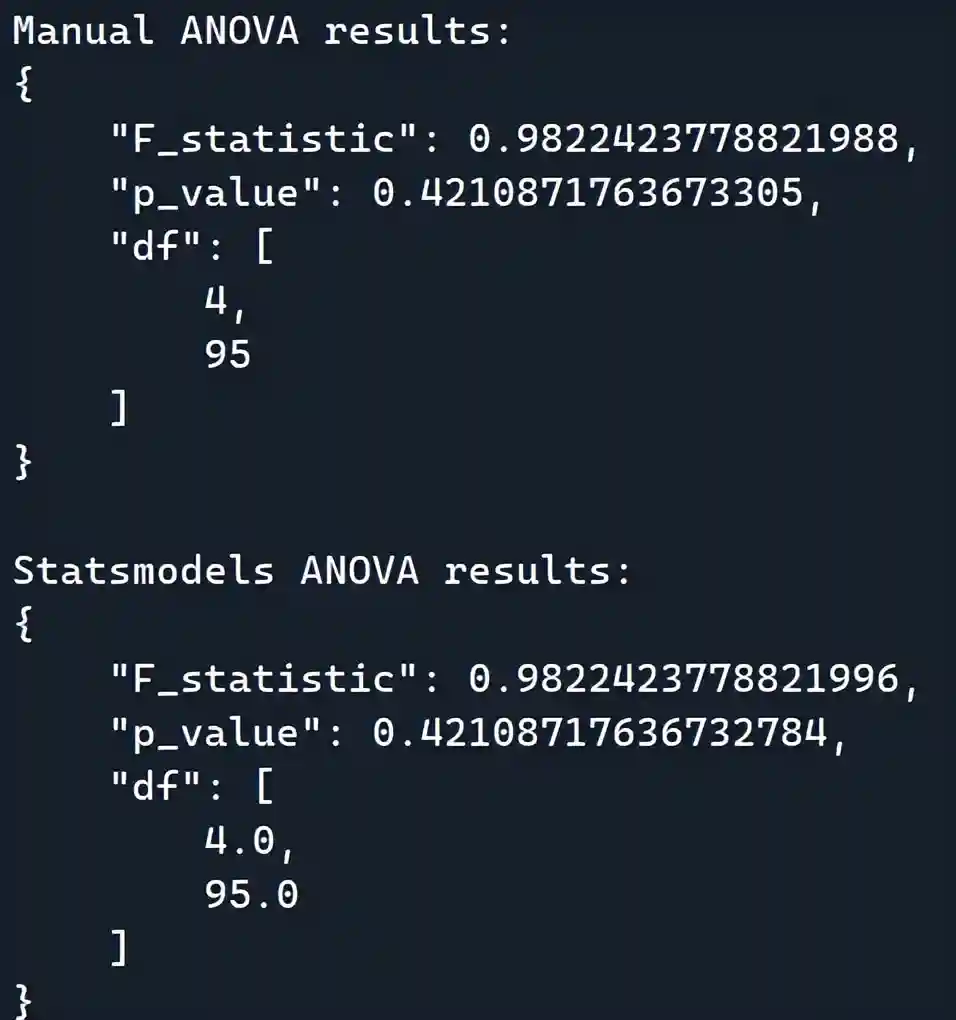 2.计算总体均值overall_mean=df_long['value'].mean()4.计算组间平方和(SSW)ssw=sum((df_long['value']-_numeric(df_long['column'].map(group_means)))**2)6.计算组内自由度df_within=len(df_long)-len(group_means)8.计算P值p_value=1-(f_statistic,df_between,df_within)#9.组合结果和打印manual_anova_results={"F_statistic":f_statistic,"p_value":p_value,"df":(df_between,df_within)}手动python计算和用statsmodel的anova计算结果对比