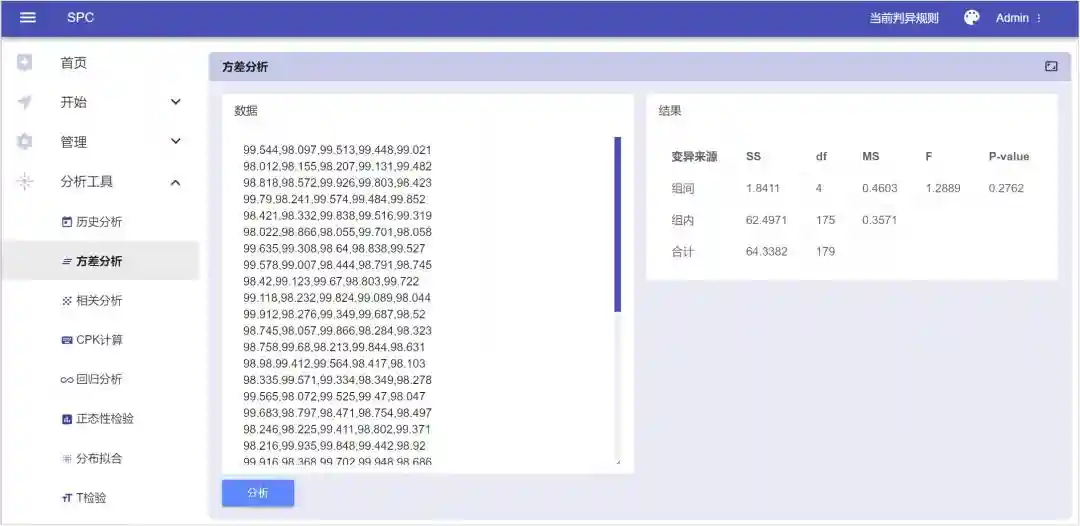 上述的“总体平方和=组内平方和+组间平方和”是在方差分析中使用得最多的。我们简易SPC也提供方差分析功能,并且整合到SPC分析报告中。