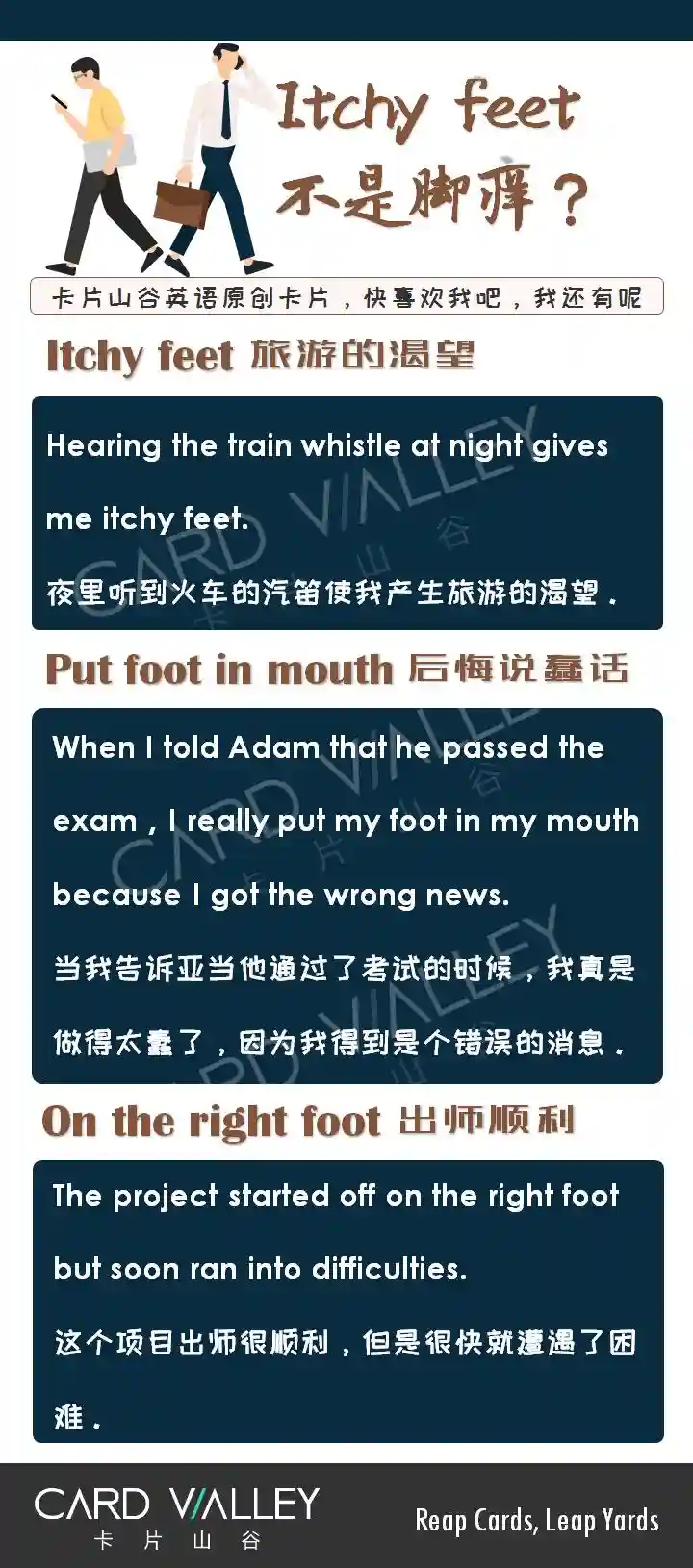 常见的词组大家知道的有onfoot,表示步行;或者还有餐厅或购物用语footthebill,表示买单(foot做动词)。那itchyfeet呢?