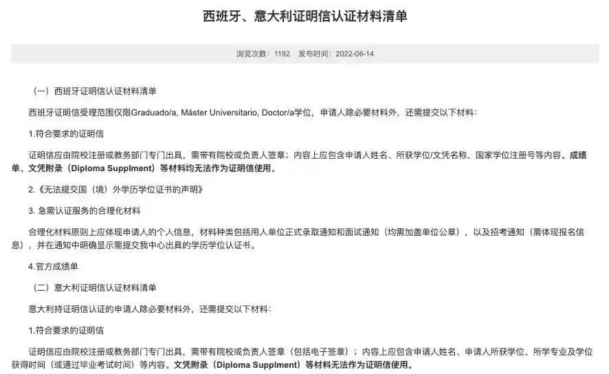 6月14日,教育部留学服务中心发布了最新的海外学历认证规范通知。通知中明确表示:从2023年1月1日起,除西班牙、意大利两国的官方学位外,不再为其他国别(地区)尚未获得证书的证明信持有者提供认证服务。