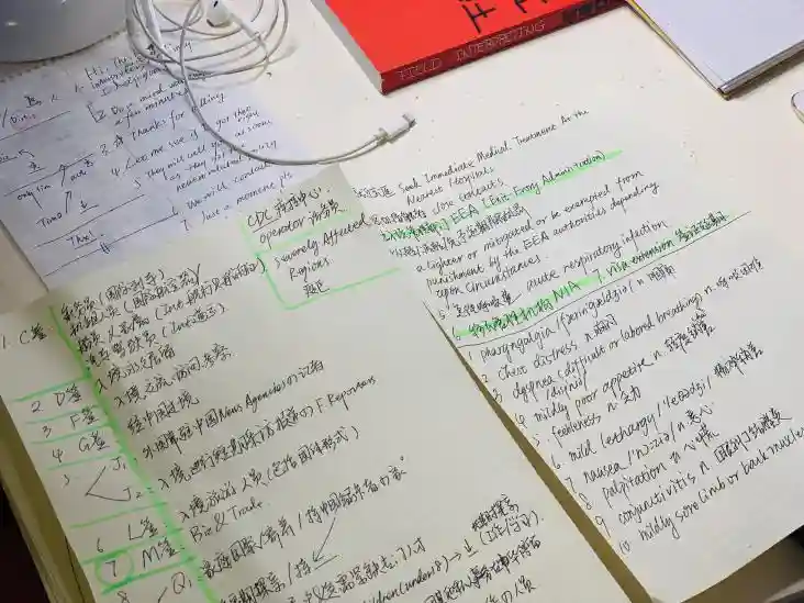 3月5日凌晨4点,吴斯琪的手机突然响了起来,听到熟悉的“有一位外宾需要语言服务,您能帮忙接听一下吗?”她马上清醒起床,坐在桌子上握好笔,进入口译的工作状态。