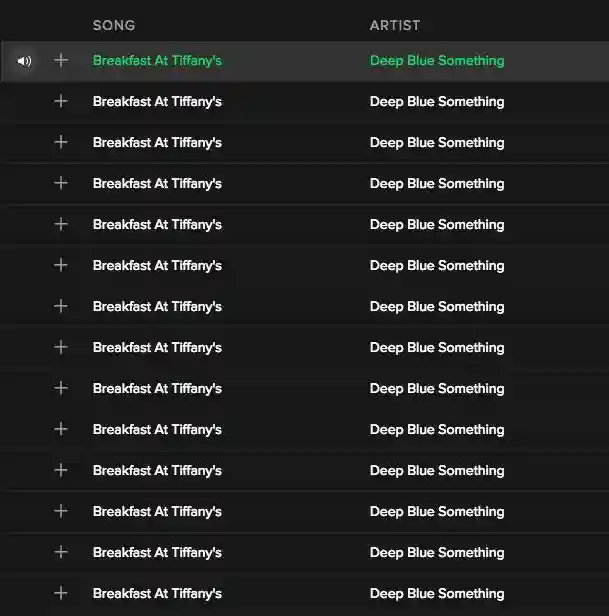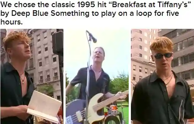 然后俩人选择了1995年的经典热曲----DeepBlueSomething演唱的《蒂凡尼的早餐》作为循环播放5小时的曲子。