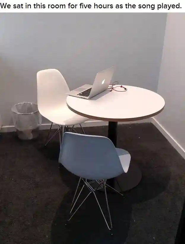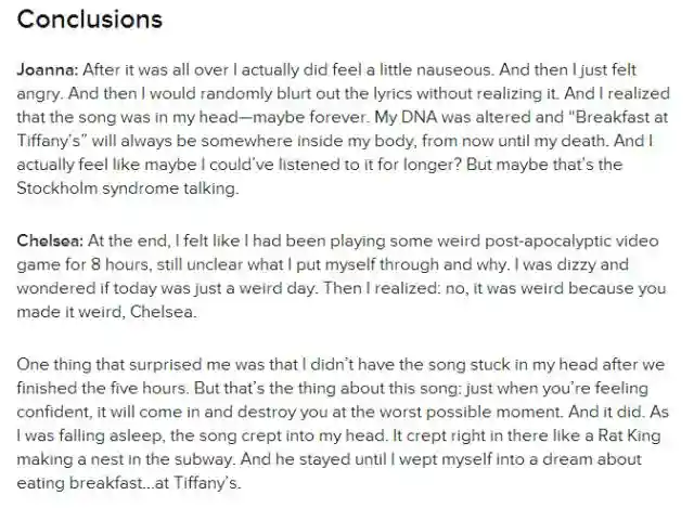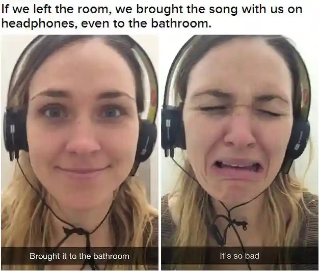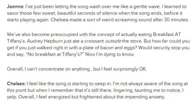 一开始,俩人就兴致盎然滴高调宣布,俩人的这个计划~~WeListenedToTheSameSongOnRepeatForFiveHours.俩人还乐滋滋滴猜测结局:Wewantedknow:Canapersongofivehourslisteningtothesamesongonrepeat?WouldwebeOKafterward?Wouldwegetsick?Startcrying?我们想知道,人真的可以连续五个小时循环听同一首单曲吗?在那之后俺们还好吗?俺们会生病吗?会嚎啕大哭吗?
