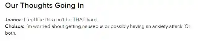 Joanna:觉得这没啥难的。Chelsea:我担心我会恶心或产生焦虑感觉,或者两样全占了。