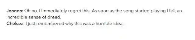 Joanna:我立刻就开始后悔了。这首歌一响起,我就觉得自己有种想死的赶脚。。。Chelsea:我才发现这个计划是多糟糕的一个主意。。。