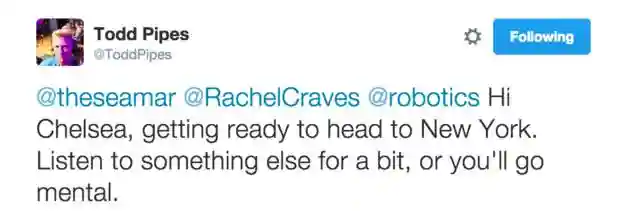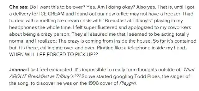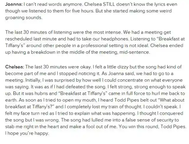 Chelsea已经濒于崩溃的边缘了。。。Joanna竟然开始Google《蒂凡尼的早餐》的演唱者ToddPipes了。。搞笑的是ToddPipes还劝告他们不要继续听下去了,否则后果自负。。