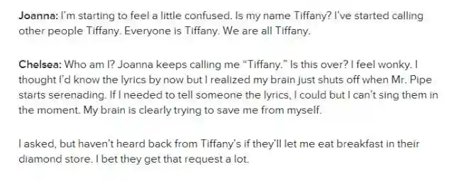 Joanna开始觉得人人都叫蒂凡尼了。。。Chelsea也开始质疑自己到底是谁了。。还向蒂凡尼珠宝店求证,是否可以在店内饮食。。