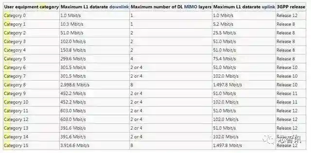 根据3GPP的定义,将UE-Category划分为1-15共15个等级,其中,由2009年3月3GPP发布Release8版本定义,由2011年3GPP发布的Release10定义。随后的Release11定义了,Release12定义了。