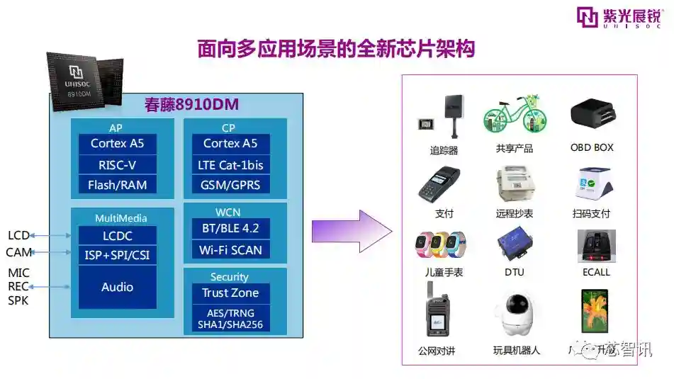 2019年11月,紫光展锐也推出了旗下首款和GSM双模芯片——春藤8910DM。采用28nm成熟工艺,上行速率达5Mbps,下行速率达10Mbps,并拥有高集成度,同时集成了蓝牙通讯和Wi-Fi室内定位,支持VoLTE。可广泛应用于共享经济、金融支付、公网对讲、能源、工业控制等场景。