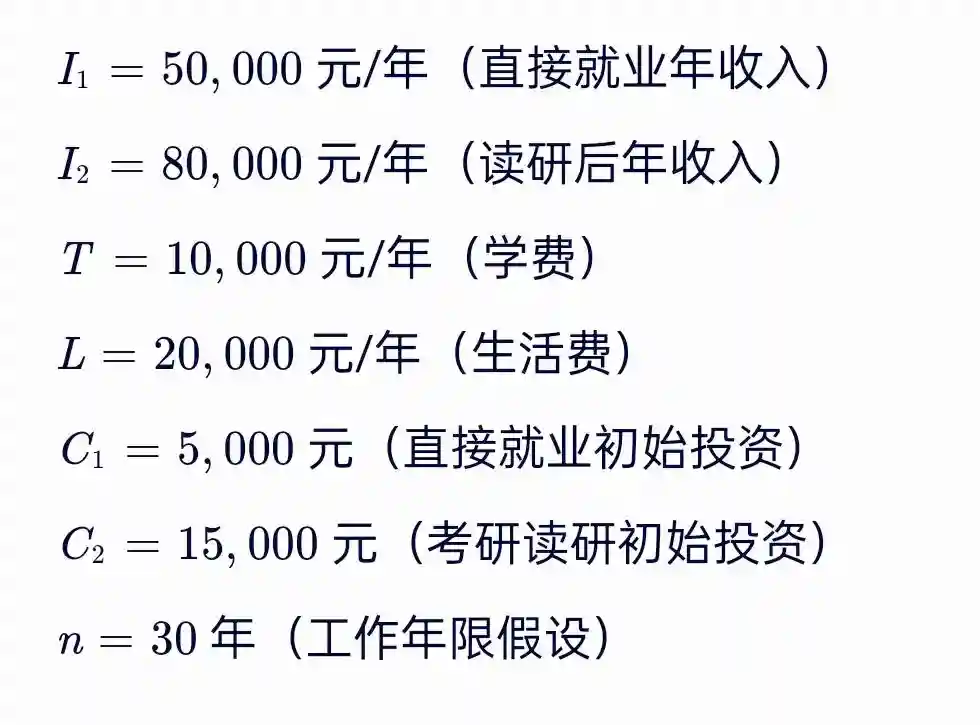 举个例子,假设某位同学决定直接就业,其初始年收入为5万元人民币,并且每年保持10%的增长率;而另一位选择读研的同学则需要额外支付大约4万元的学费及生活费用,同时失去两年的工作收入。