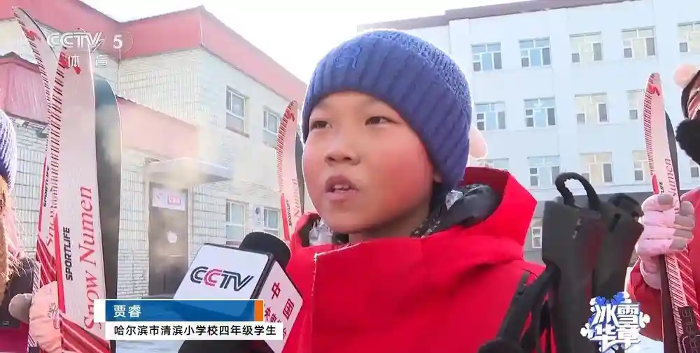哈尔滨市清滨小学校四年级学生贾睿:滑雪锻炼了我们的耐力,滑雪时可能很累,会坚持不下去。同时滑雪也锻炼了我们的平衡能力。