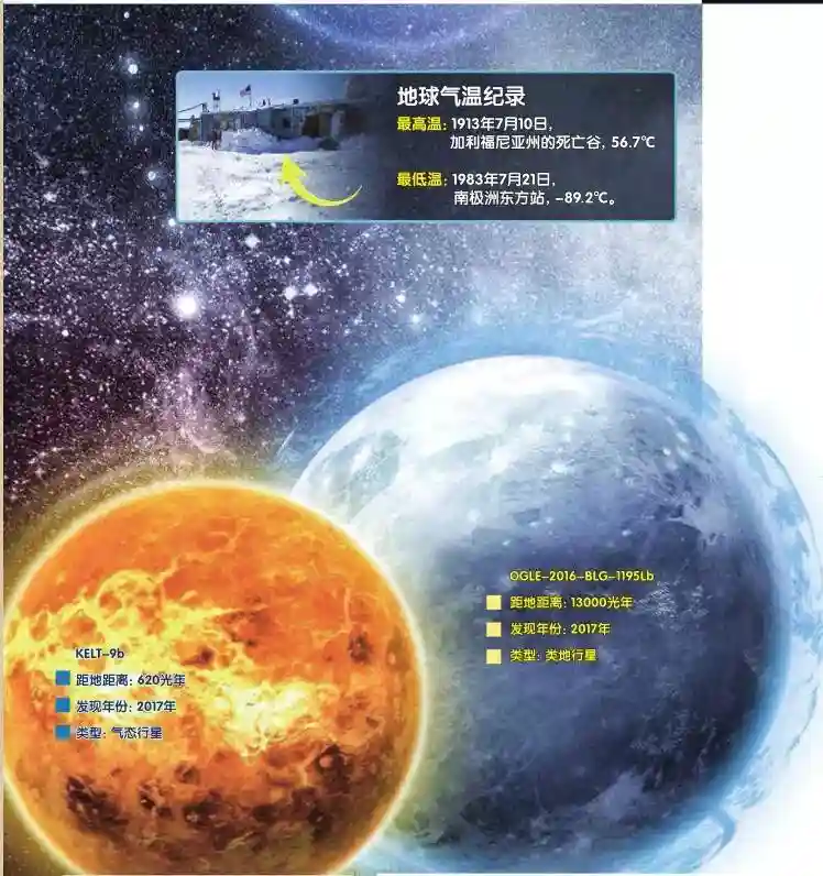 与这些系外行星相比,地球温度就令人愉悦多了。人类历史记录中,地球上的最高温出现在美国加利福尼亚州的死亡谷,1913年7月10日,温度56.7℃。最低温则是南极洲的东方站,1983年7月21日,温度-89.2℃。