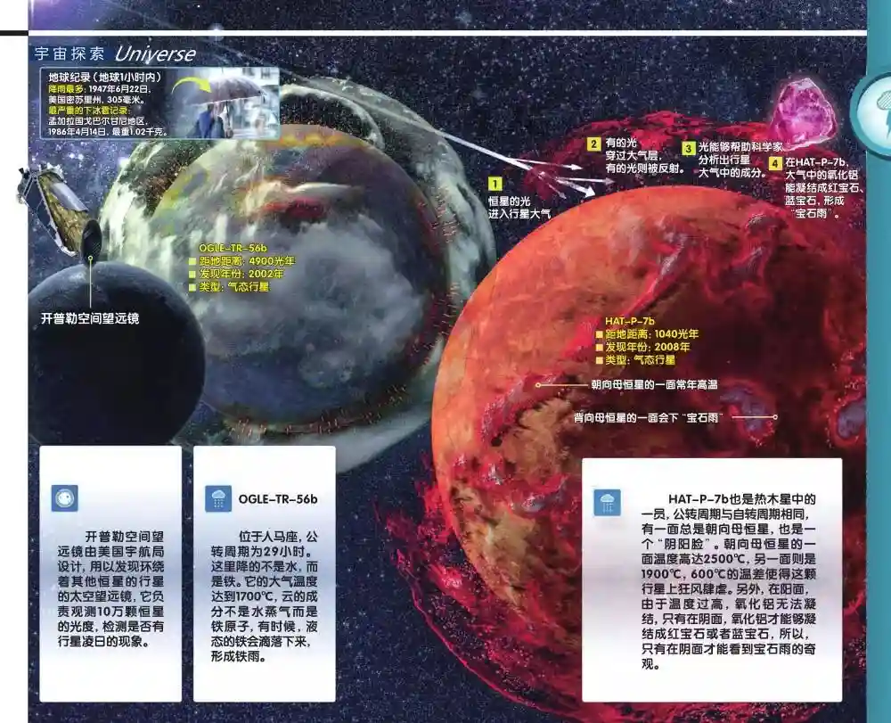 系外行星不但有降铁的,还有降宝石的。在1040光年以外,有一颗闪闪发光的行星,HAT-P-7b。这颗行星的大气中富含氧化铝,这可是红宝石、蓝宝石的主要成分。HAT-P-7b也是热木星中的一员,公转周期与自转周期相同,有一面总是朝向母恒星,也是一个“阴阳脸”。朝向母恒星的一面温度高达2500℃,另一面则是1900℃,600℃的温差使得这颗行星上狂风肆虐。另外,在阳面,由于温度过高,氧化铝无法凝结,只有在阴面,氧化铝才能够凝结成红宝石或者蓝宝石,所以,只有在阴面才能看到宝石雨的奇观。