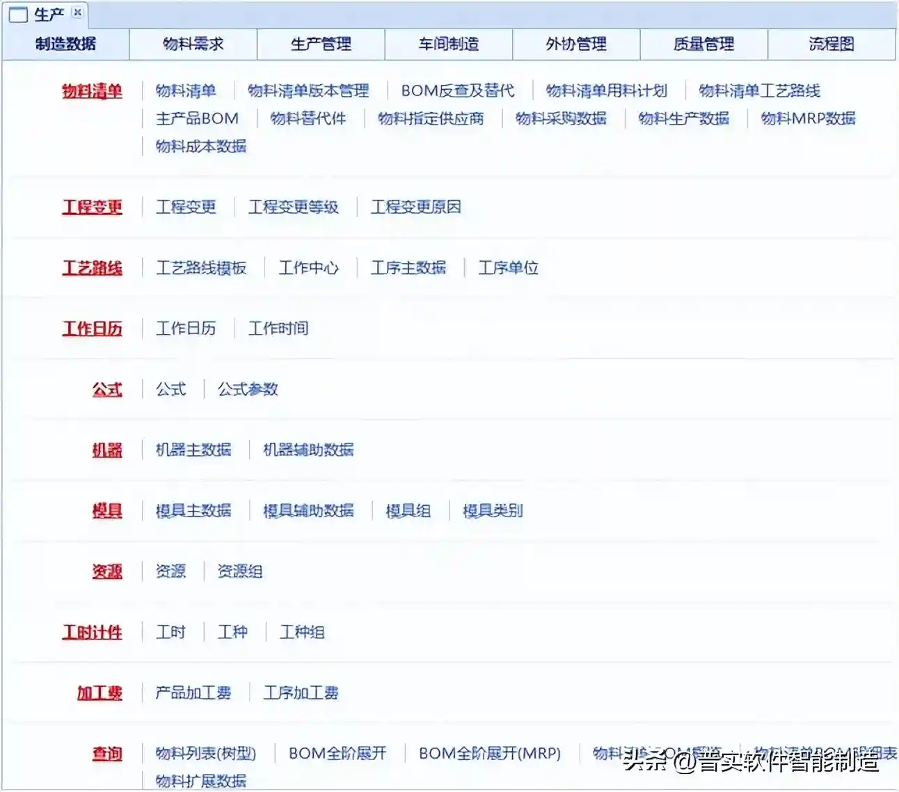 制造数据包括物料清单BOM、工艺路线、物料扩展信息、工作中心、工序、机器、模具、工种、工厂日历及其它与计划、生产、成本分摊有关的基础信息。制造数据是编制生产、采购、外协、配套领料、工序调度、工序投入产出、跟踪物流及生产过程、计算成本、改进产品设计等都需要参照的重要文件。制造数据如同一个管理枢纽,把企业各个业务部门通过物料有机地联系在一起。因此,几乎企业所有主要业务部门都要使用,并依据统一的制造数据进行工作。
