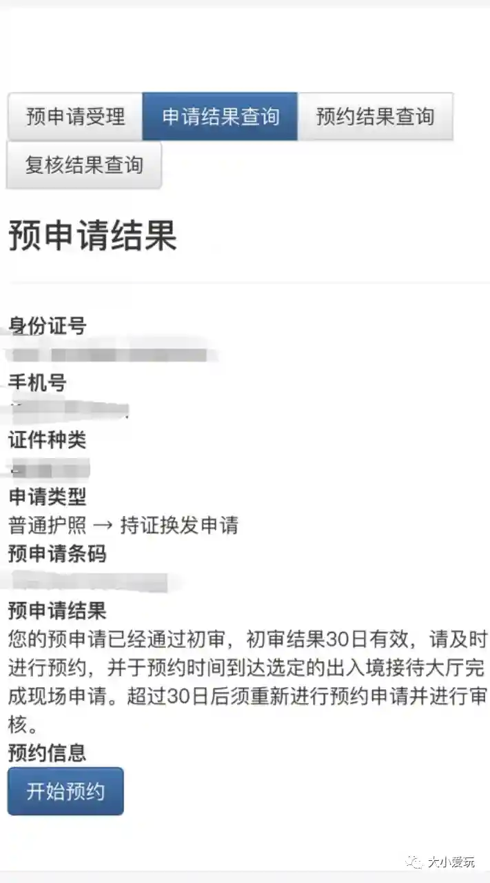 之后,大家可以在“申请结果查询这里”,用自己收到的密码,查询预申请结果,结果很快就出来了,小爱测试的时候基本上十分钟之内就能查询到通过,然后再正式开始预约。