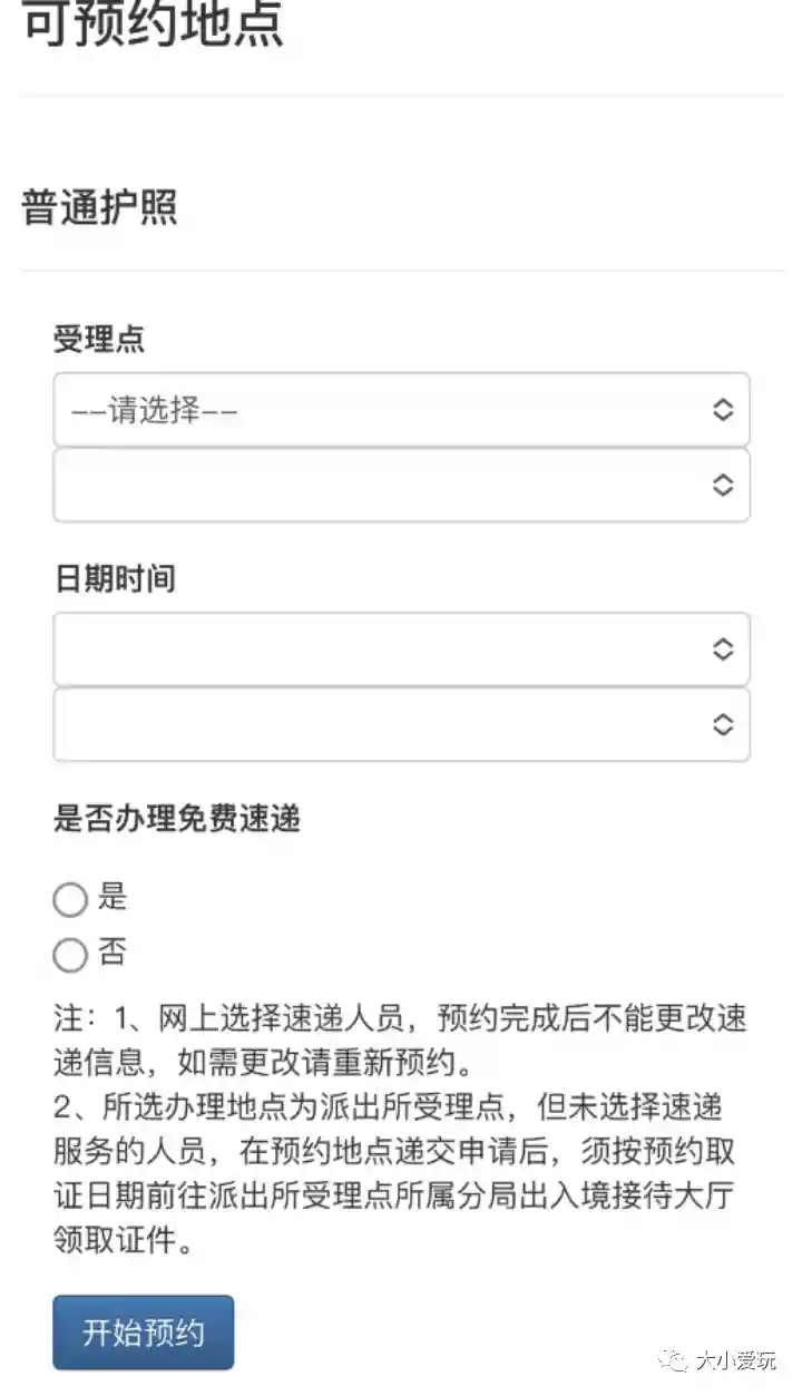 在预约页面,大家选择距离自己较近的受理点,办理日期即可,如果要进行免费速递的话,需要填写自己的地址信息。