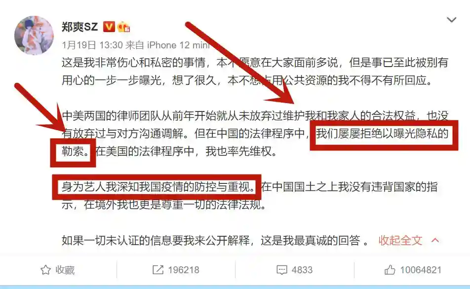 咱们先看第一条回应微博,“我们屡屡拒绝以曝光隐私的勒索”,这里有个“以”为什么不加个“为由”?郑爽你不感觉怪怪的吗?“身为艺人我深知我国疫情的防控与重视”,这是个病句好嘛!不应该是“我国对疫情防控的重视”吗?