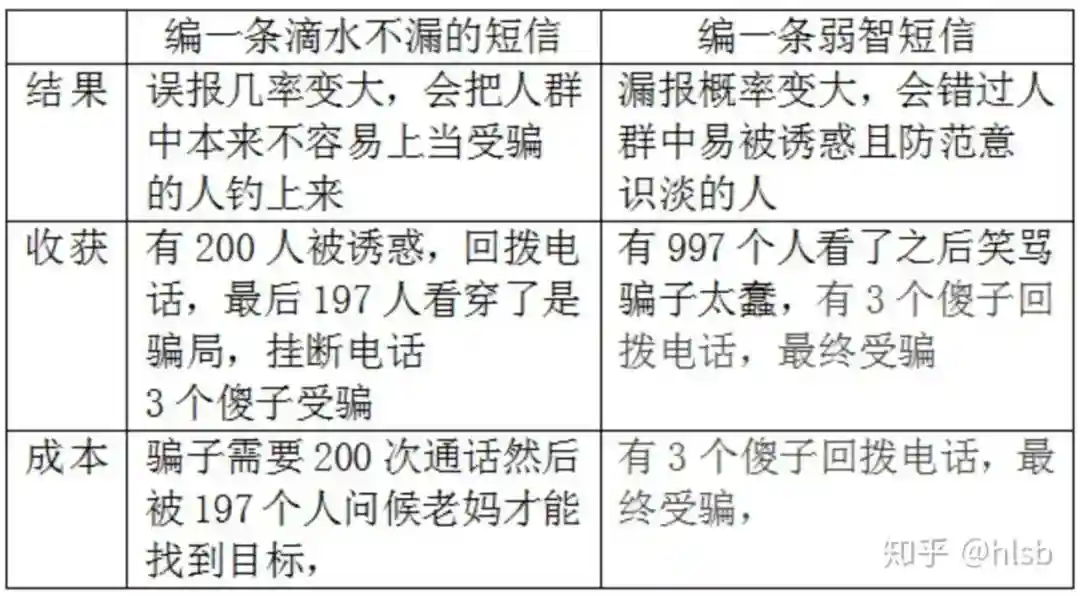 发这种傻逼短信的骗子正是最聪明的骗子。为什么呢?因为他只用一条短信就把99%的聪明人排除在外了,这样才会有精力好好对付剩下那1%打电话的人。而如果编辑了一条没有错误、滴水不漏的短信,那么他要打几百个电话才能找到易骗人群。