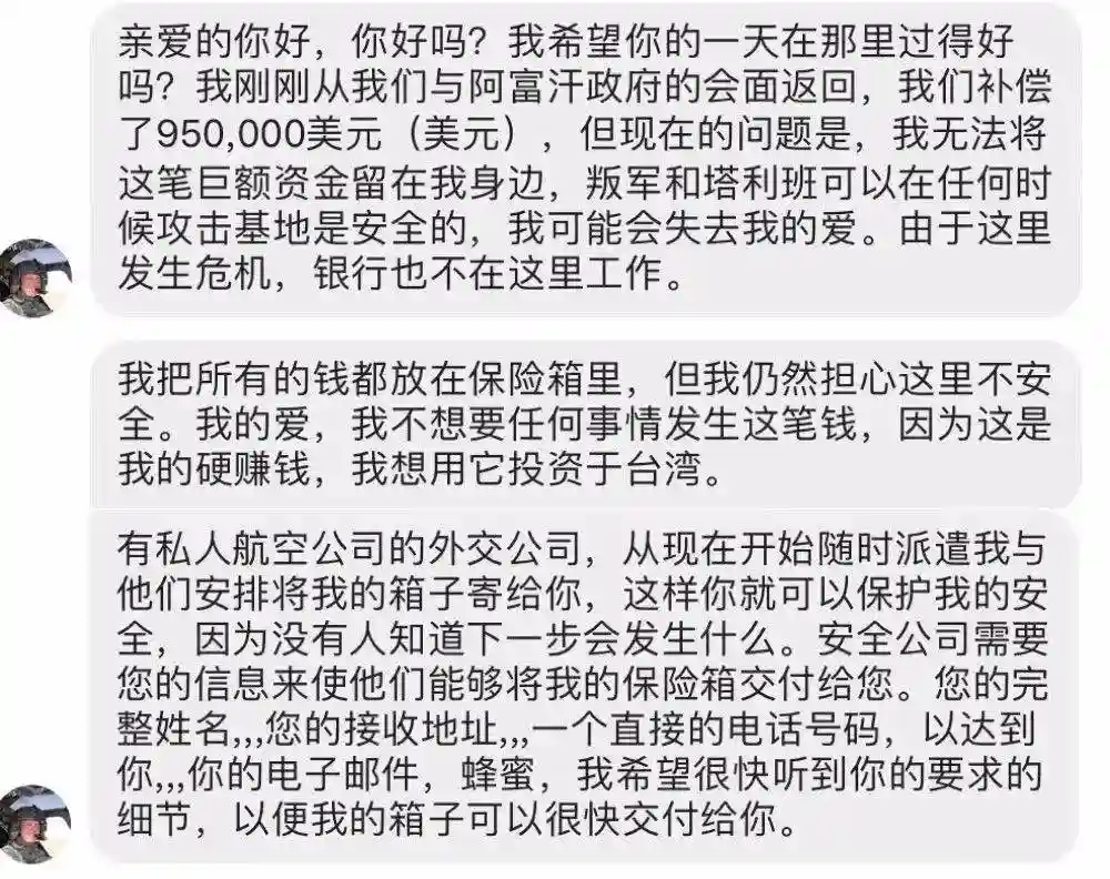 这些美国大兵发来的信息,读起来虽然语句非常不通顺,但是受害人能从中感受到美国大兵说那种蹩脚中文的语气,以及为了和你聊天他们所付出的努力,就更加相信无疑。