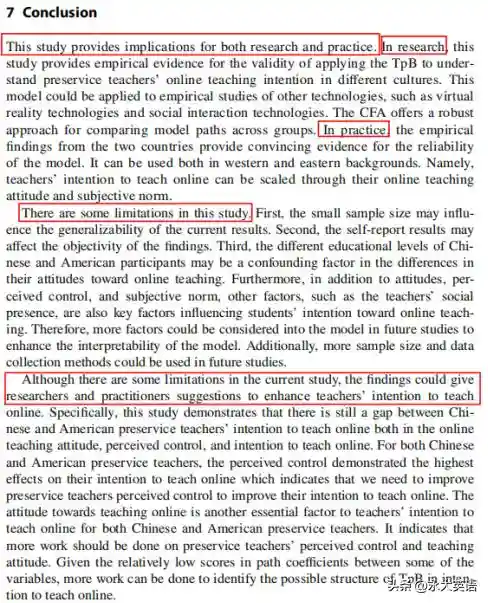 第二段开始用First、Second、Third、Furthermore、Additionally等词将整段串联起来,先列举局限性,分别为“首先,小样本量可能会影响当前结果的普遍性。第二,自我报告的结果可能会影响调查结果的客观性。第三,中美参与者的不同教育水平可能是他们对在线教学态度差异的一个混淆因素。”在说完局限性后,引出未来发展方向“因此,在未来的研究中,可以在模型中考虑更多的因素,以增强模型的可解释性。此外,在未来的研究中可以使用更多的样本量和数据收集方法。”