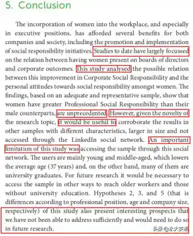 作者先用“Studiestodatehavelargelyfocusedon”阐明了当前研究主要集中在“让女性进入董事会与公司业绩之间的关系上”,之后作者用“Thisstudyanalysed”概括了本文的研究内容“本研究分析了企业社会责任的改善与女性对社会责任的个人态度之间的可能关系”。“Thefindings,basedonanadequateandrepresentativesample,showthat,areunprecedented”这一句在说明研究结果的同时,也用“unprecedented”一词体现了创新性为“基于充分且具有代表性的样本调查结果表明,女性比男性同行具有更大的职业社会责任,这一结果前所未有的”。为了强化这一观点,作者又提出“考虑到研究主题的新颖性,在其他具有不同特征、数量更大以及在LinkedIn之外的样本中可能也会证实该结果”。
