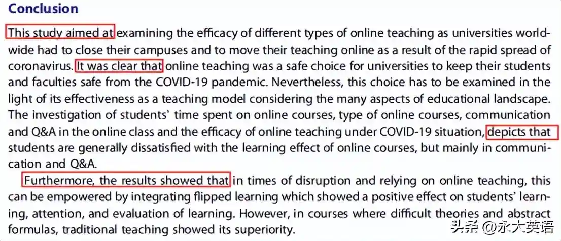 首先,作者使用“Thisstudyaimedatexamining”的句型重申了本文的研究目的是“由于冠状病毒的迅速传播,世界各地的大学不得不关闭校园并将教学转移到网上,因此这项研究旨在研究不同类型在线教学的效果”。紧接着使用一个非常简单的主语从句“Itwasclearthat”引出“对于大学来说,在线教学是一个安全的选择,可以保护学生和教师免受COVID-19的影响”。由于此文发刊于2020年,因此在当时全球疫情肆虐的大环境下,研究在线教学是一个具有必要性/迫切性的问题。