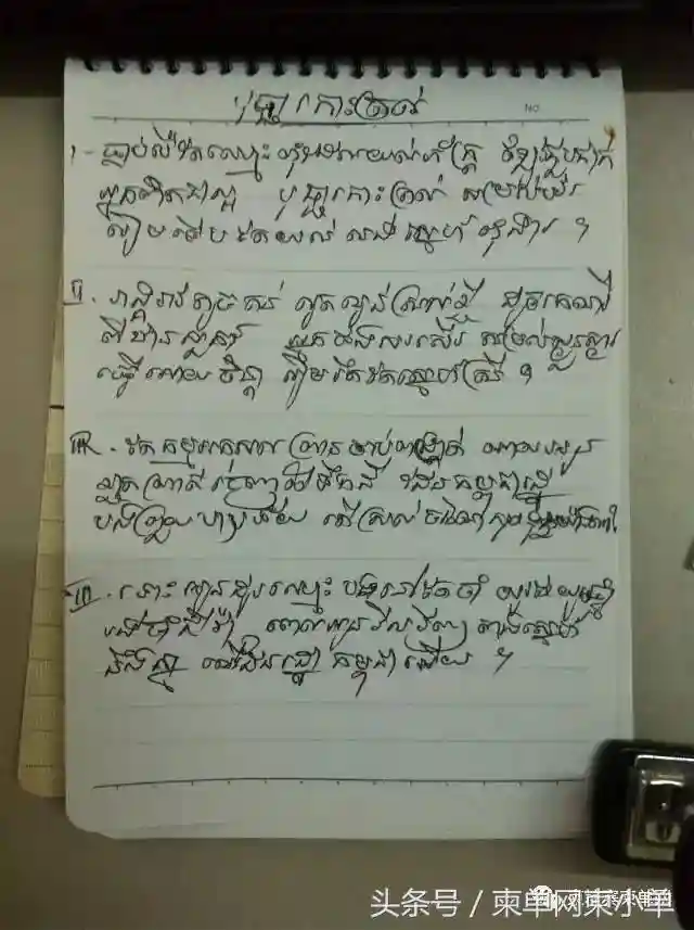 高棉文由古印度婆罗米兰文字发展而来,每一个字母都是各种变形弧线与小圆圈的组合,几乎没有汉文字基本的横竖笔画,而且字母一写一串,词语之间毫无分隔。但是这种文字看起来很美丽。在开车等红灯、机场里等人、会议等开场的间隙,我学会了认识和书写这种文字。写完之后拿出示人,彼时金边的柬语界“大师姐”翔青笑道:这写的是高棉文美术字,和俺们写的不一样。